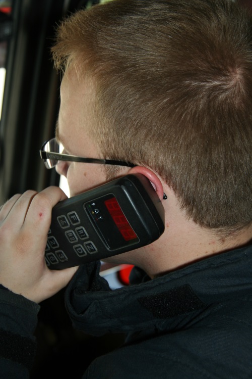 | 4. Der Gruppenführer meldet das Fahrzeug bei der Feuerwehrleitstelle als einsatzbereit. Jetzt wird er über eventuelle Lageänderungen oder spezielle Anfahrtswege informiert. |