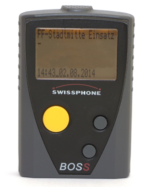 | 1. Alarmierung der Einheit Stadtmitte über digitale Funkmeldeempfänger. Auf dem digitalen Funkmeldeempfänger wird eine kurze Einsatzinformation angezeigt. Was ist passiert (Feuer, Unfall...) und wo ist es passiert. Dazu kommen Zusatzinformationen, wie zum Beispiel Anfahrt oder Stockwerk. | ![]() |