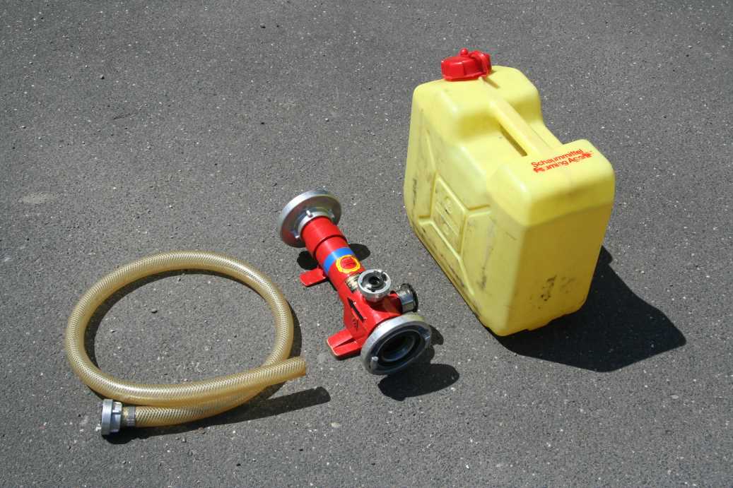 SchaumequipmentDas Schaumequipment dient zur Erzeugung des Löschmittels Schaum. In einem Schaummittelkanister werden 20 Liter Schaummittel transportiert. Durch den gelben Ansaugschlauch zieht sich der Zumischer über das Injektorprinzip das Schaummittel an und mischt dann das durchfließende Wasser mit dem Schaummittel. Im Zuge der Fahrzeugumstellung (HLF 20/16) der FF Stadtmitte ist dies nicht mehr erforderlich. Das Fahrzeug hat jetzt einen fest eingebauten 200l Schaumtank. Das Zumischen wird im Falle eines Schaumeinsatzes vom Maschinisten über die Elektonik automatisiert gesteuert. |