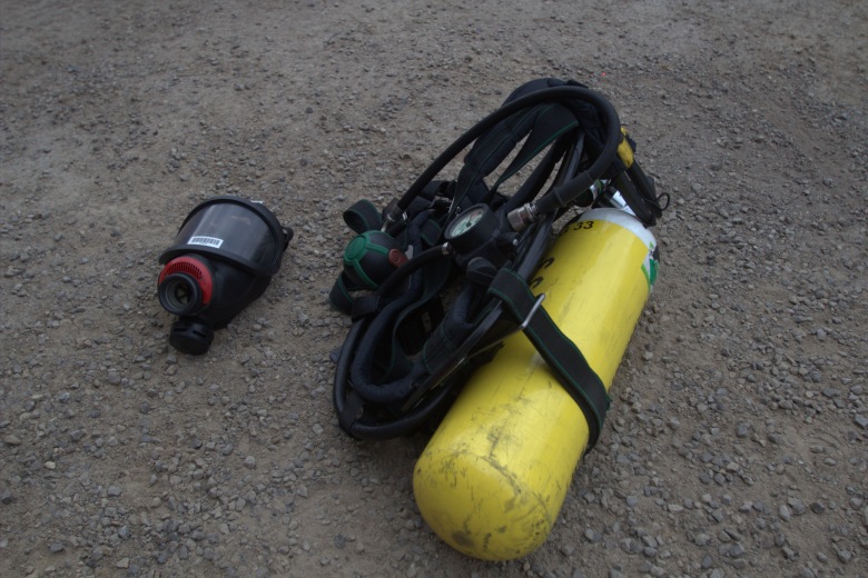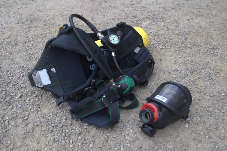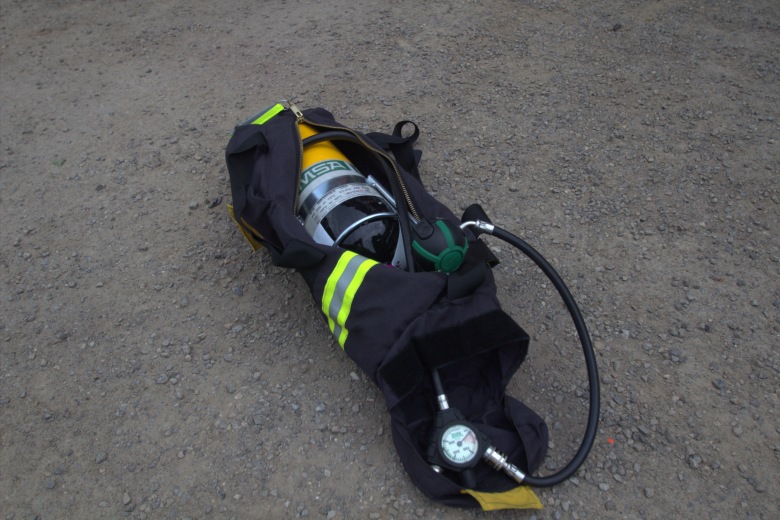 AtemschutzgerätDas Atemschutzgerät oder auch Pressluftatmer genannt schützt die Feuerwehrmänner vor schädlichen Atemgiften, wie beispielsweise Rauch oder verschiedene Dämpfe. Die sechs Liter große Flasche wird mit einem Druck von ca.300bar mit Atemluft befüllt. Diese Luft strömt über die Atemschutzmaske und den Lungenautomat zum Feuerwehrmann. Die Atemschutzmaske wird über das Gesicht gezogen und schließt dieses ab. So kann keine Atemluft entweichen bzw. andere Dinge in die Maske eindringen. Die Arbeitsdauer ist je nach Körperbelastung und körperliche Fitness verschieden. Eine Faustregel besagt, dass man ca.30 min mit einer Atemschutzflasche auskommt. |