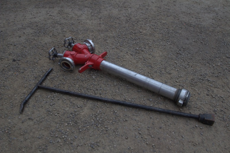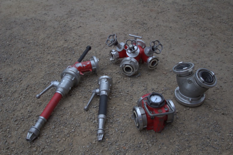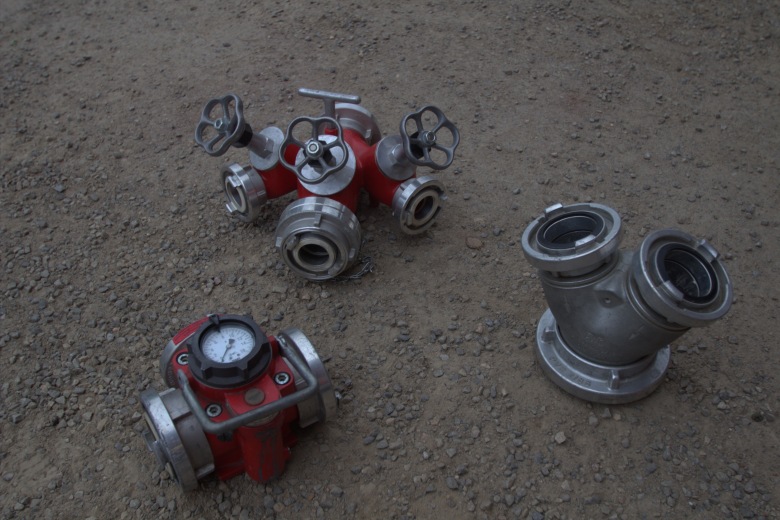 Wasserführende ArmaturenBei der Feuerwehr gibt es verschiedene Wasserführende Armaturen in diesem Fall gezeigt (von links nach rechts) ein B-Druckbegrenzungsventil, ein B-CBC Verteiler und ein A-2B Sammelstück. Das B-Druckbegrenzungsventil dient dazu einen konstanen Druck halten zukönnen zum Beispiel um Druckschläge zu minimieren. Der Verteiler ist dafür da um von einer großen Schlauchleitung auf mehrere kleiner Leitungen zuverteilen. Die Schläuche werden hier bei immer nach dem Schema links-rechts-mitte angeschlossen. In der Mitte besteht die Möglichkeit ein Sonderrohr (B-Strahlrohr/Schaumrohr oder Wenderohr einer Drehleiter) anzuschliessen. Im normalen Einsatzfall schliesst hier, mittels eines Übergangsstück der Sicherheitstrupp sein Rohr an. Das Sammelstück dient dazu Schläuche der Wasserversorgung an die Pumpe anzuschliessen. |