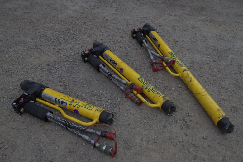 RettungszylinderDie Rettungszylinder gehören zusammen mit der Retttungschere und dem Rettungsspreizer zu der Gruppe der hydraulischen Rettungsgeräten. Sie werden bei der Technischen Hilfeleistung zum auseinanderdrücken, von zum Beispiel bei Verkehrsunfällen, deformierten Fahrzeugen und zur Personenbefreiung eingesetzt. Diese drei Rettungszylindern arbeiten mit einen Druck von bis zu 630 bar und bringen eine Druckkraft von 120 kN (ca. 12000 kg) auf. Der kleinste hat eine zusammengefahrende Länge von 530 mm und ausgefahren eine Länge von 850 mm. Der mittlere ist eingefahren 750 mm lang und ausgefahren 1250 mm. Der Größte der drei Rettungszylinder, die sich bei uns im Einsatz befinden ist zusammen gefahren 1100 mm lang und ausgefahren 1600 mm. |